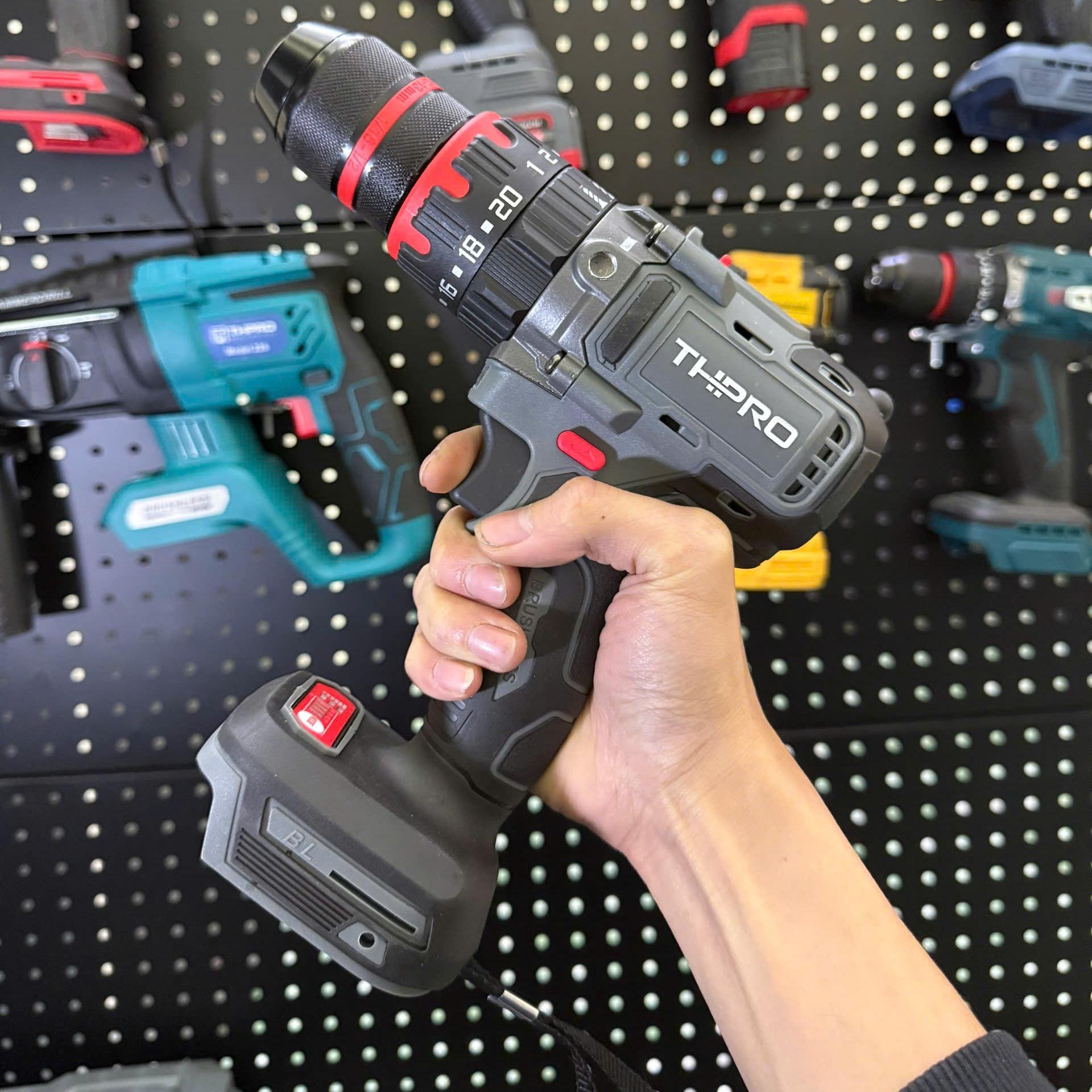 Máy Khoan Pin 13 li THPRO, 3 chức năng có búa 20 cấp trượt, đầu kẹp sắt có auto-lock, có khóa trục