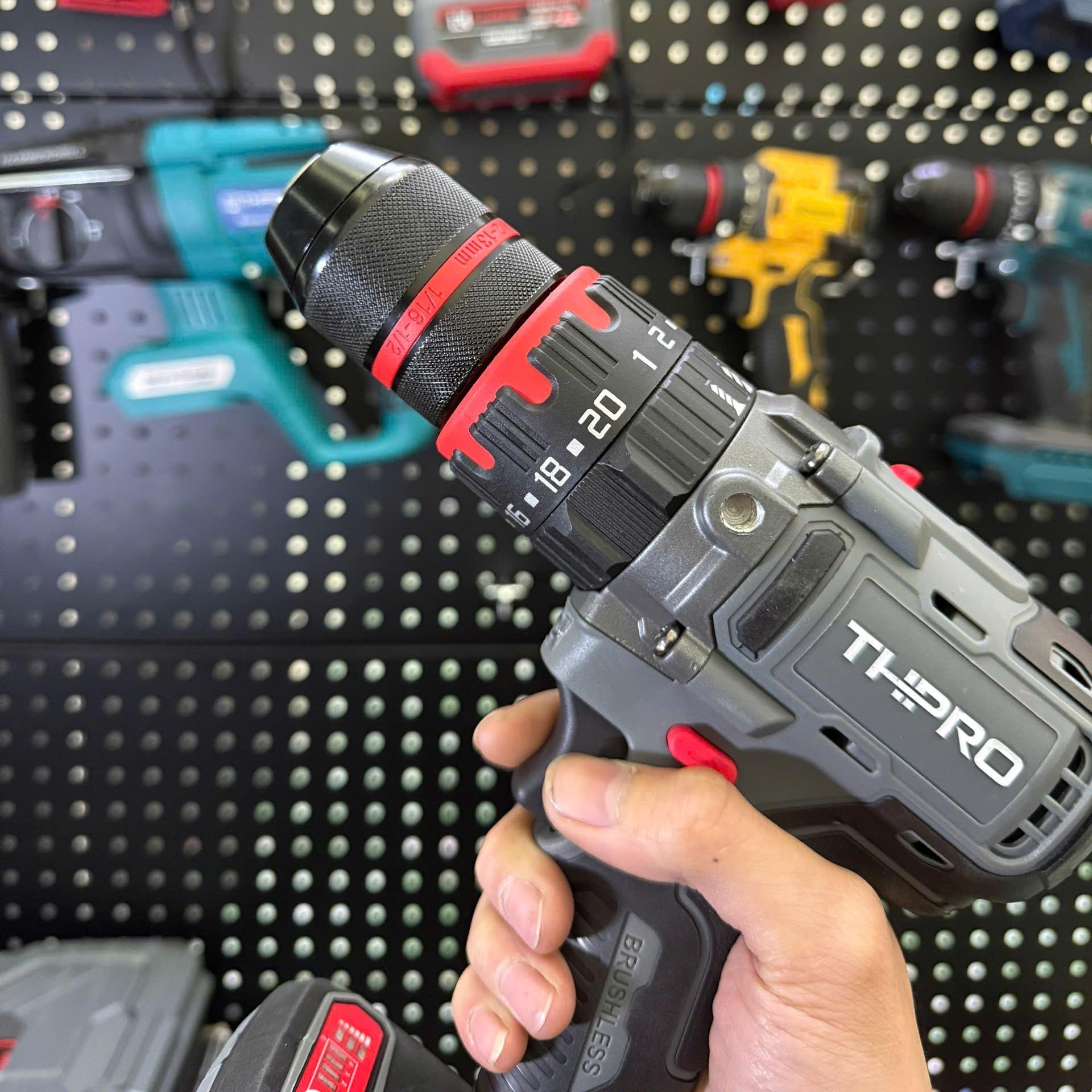 Máy Khoan Pin 13 li THPRO, 3 chức năng có búa 20 cấp trượt, đầu kẹp sắt có auto-lock, có khóa trục